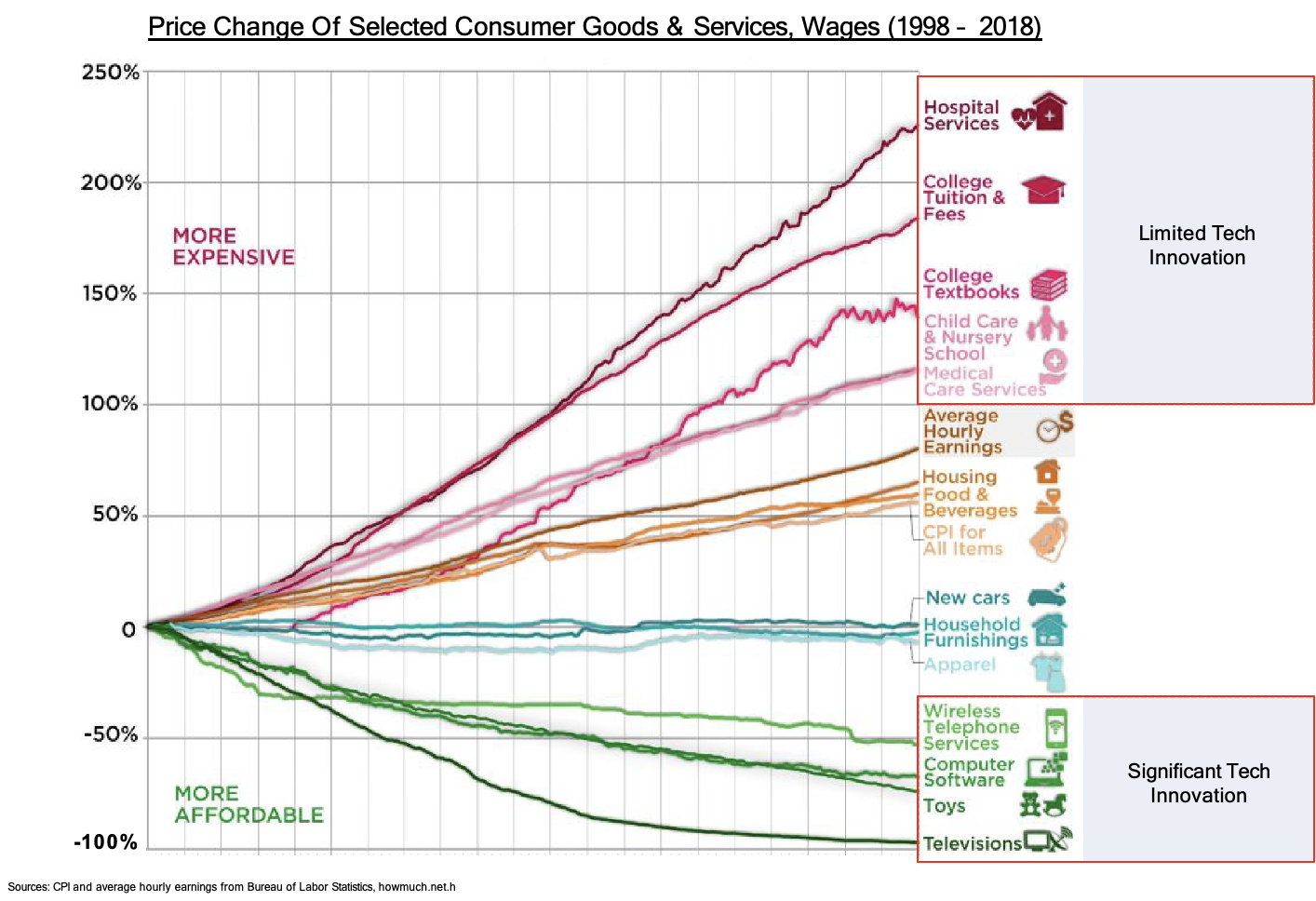 Over 50% of respondents in a 2020 Gallup survey feared bankruptcy due to a health event and based on the data their concerns are justified. The chart below maps the price increases of Hospital Services since 1998 and the price growth outpaces even those Universities we're so mad with for racking up student debt.