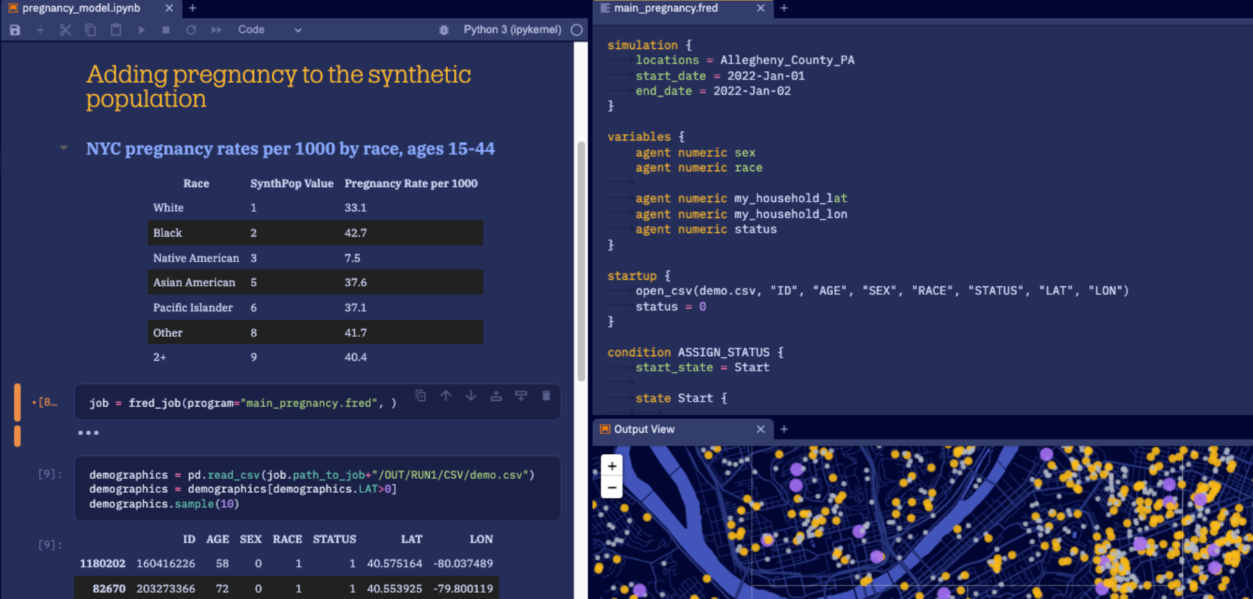 The current iteration of their product allows customers to create agent-based models to simulate outcomes of policy decisions and is built on top of a synthetic population of the United States that is statistically accurate down to the census block level.