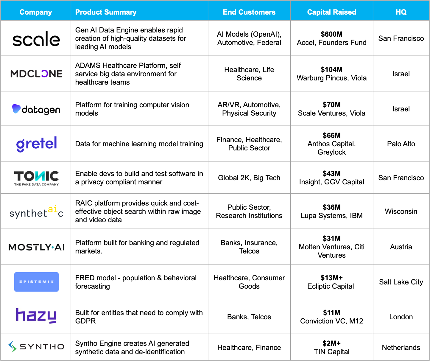 As we'll see below, the synthetic data category has gone from an interesting new tech category in the late 2010s to a critical enabling technology for advanced AI research and ML modeling.